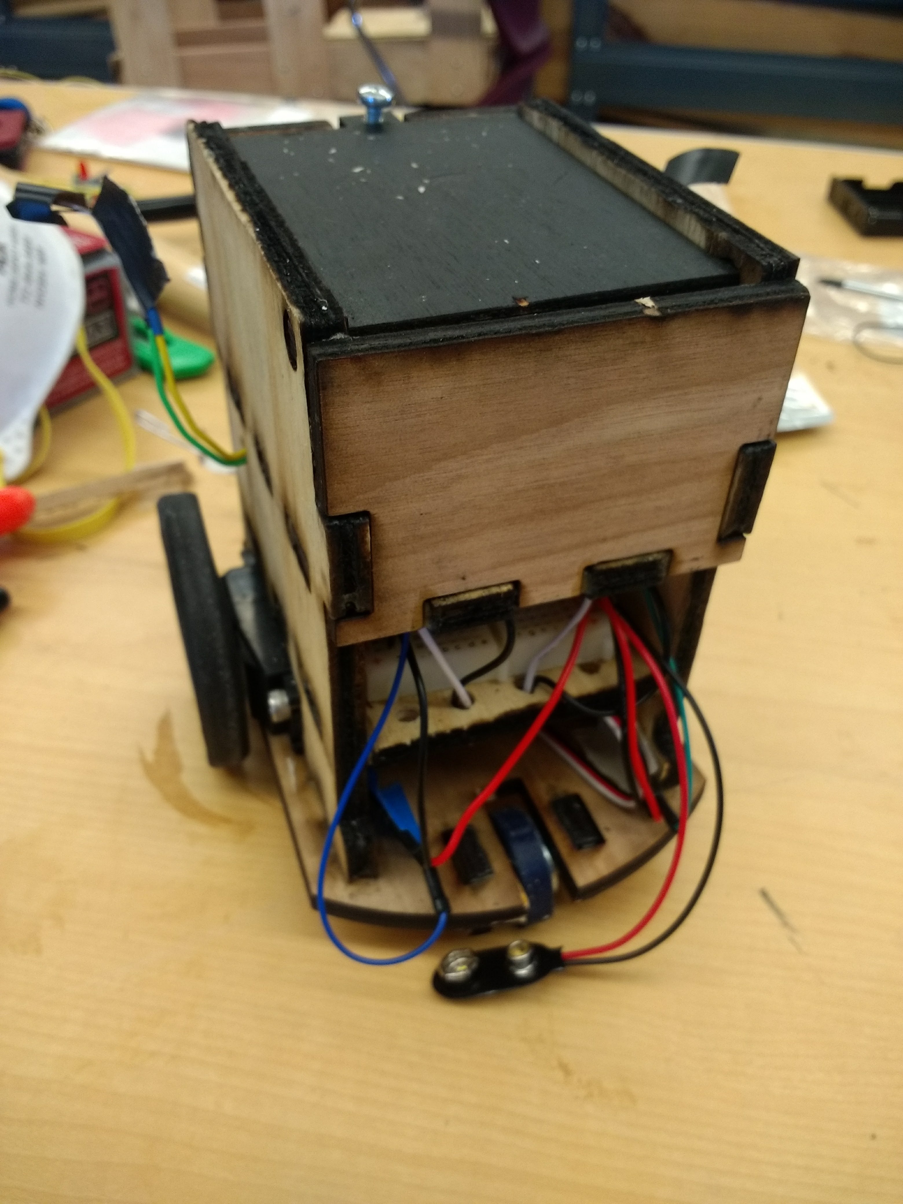 For collisions with parts of the maze, I wanted to be able to easily turn on the spot, so I used two motorized large wheels with a small caster wheel in the back to stay balanced. I also designed my car to be centralized (as in not long in one direction) to help with the turning, and this led me to built upward to have room for a breadboard and Arduino. So, I designed the frame, lasercut it out of plywood, and glued it together. I used two continuous rotation servos to drive the wheels, as I was more concerned about maneuvering through the maze than speed.