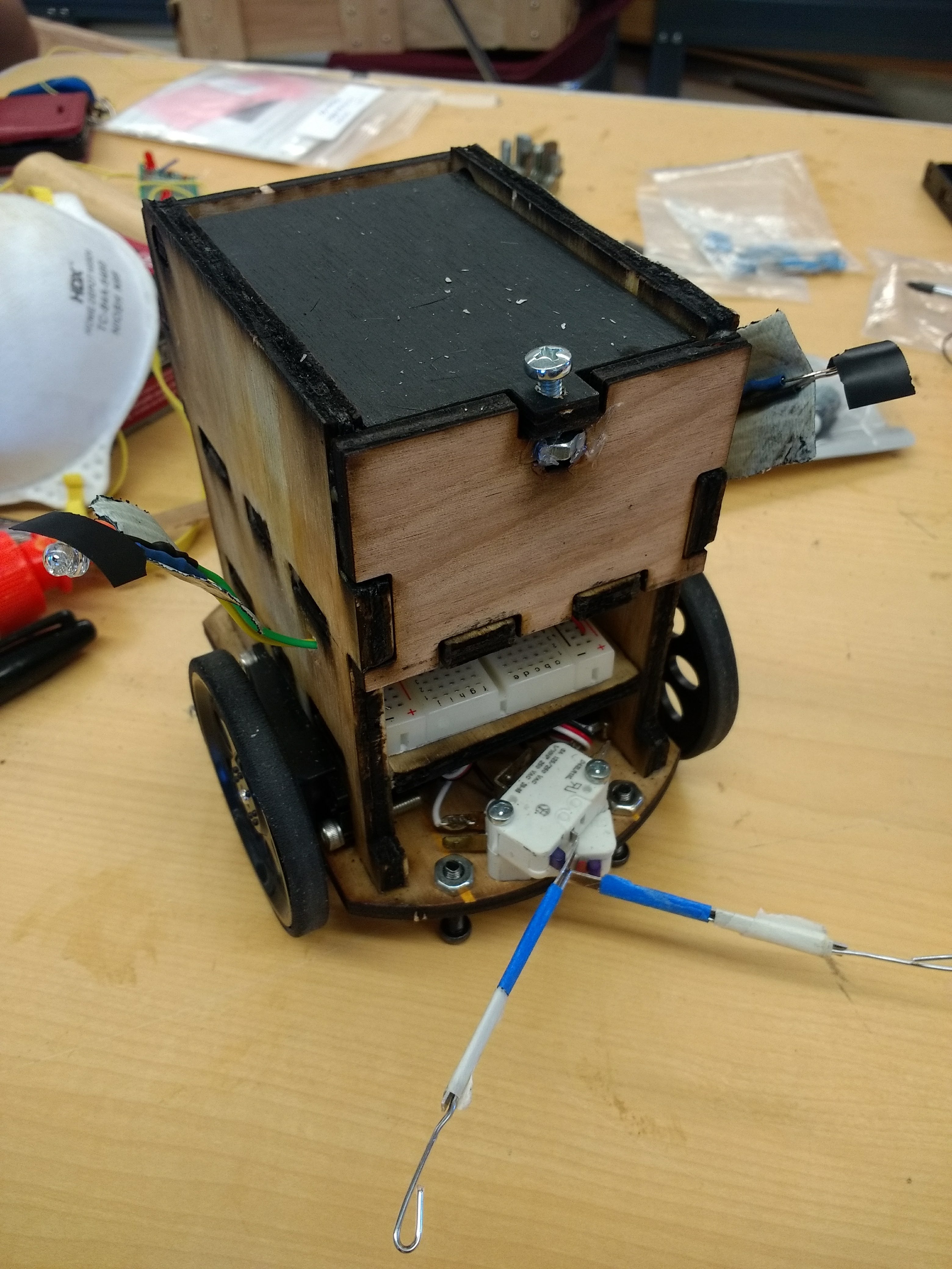 To detect collisions in the maze, I extended the reach of two limit switches that would be activated if the robot car drove forward into something. For light detection, I attached two photoresistors to the left and right side of the car. Essentially, if the left one received more light, I would spin the right wheel faster (to turn left), and vice versa for the right photoresistor.